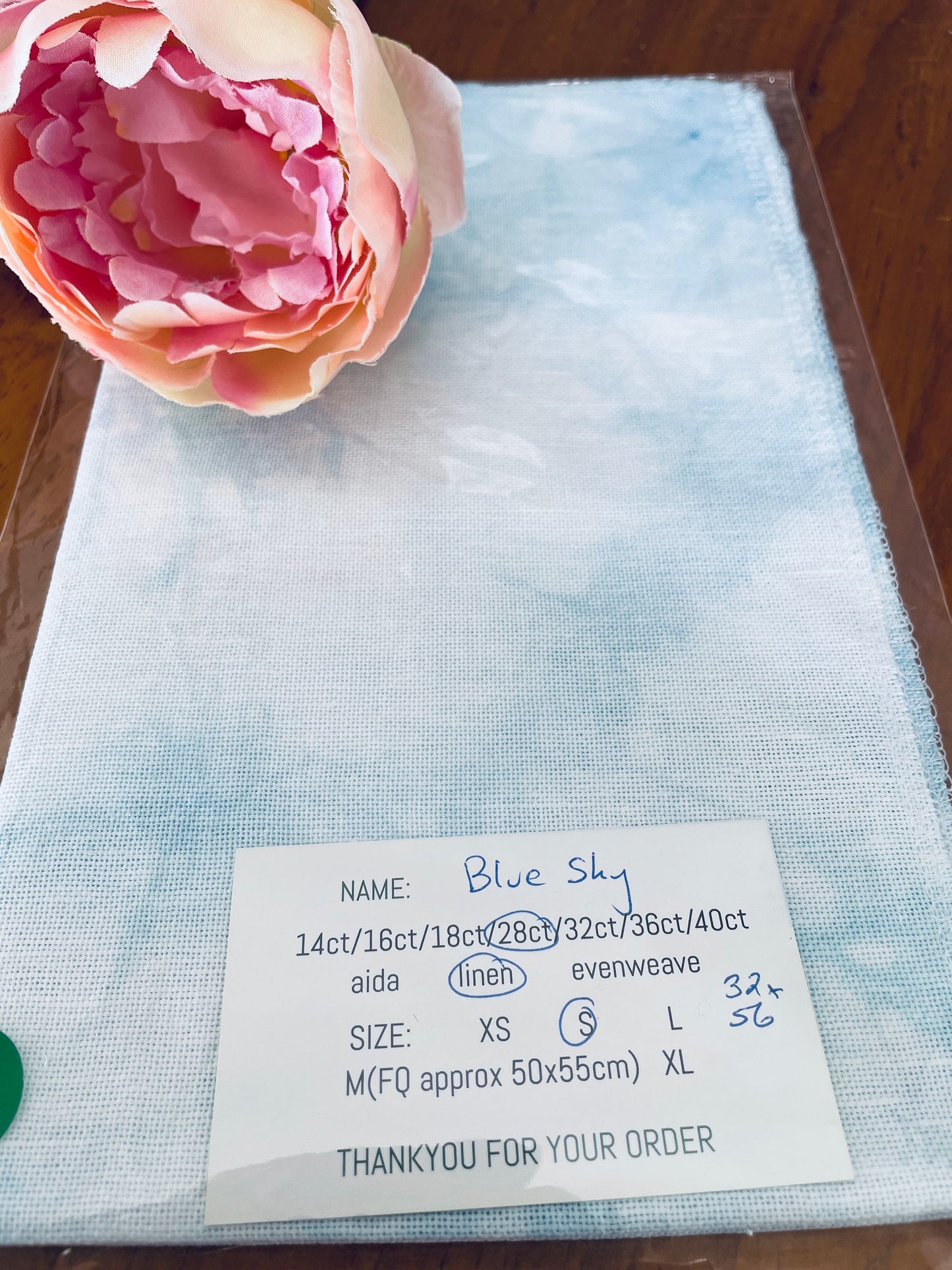 A hand dyed cross stitch fabric with 3 colours - Very pale blue with a mottled dye.